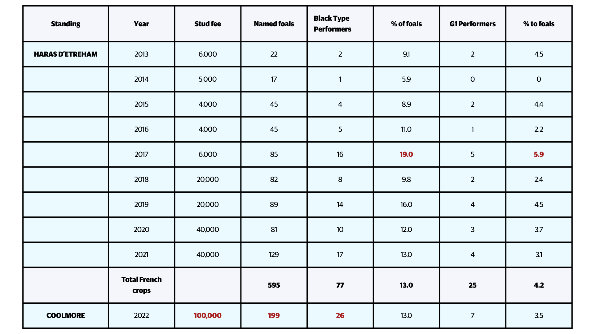 For 2016, Etreham increased Wootton Bassett’s fee to €6,000 and then to €20,000 in 2017 and, for his last two years in France, to €40,000 for 2019 and 2020. His book size also became much larger.